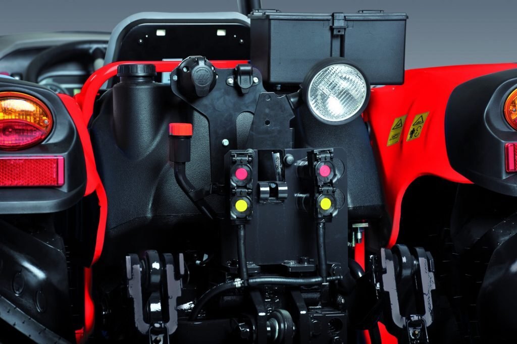 The ROPS models feature as standard a hydraulic system with a double pump that supplies 13.2 gpm (50 l/min) to the rear hitch and remotes and 7.4 gpm (28 l/min)to the steering system. 2 mid-mounted valves, 1 standard and 1 float, come standard with the X4F and GE tractors. Available as an option with 2 spool valves are S/D acting (1 motor with flow divider + 1 float) or D/E (1 motor with flow diverter + 1 kick out). A flow selector is also available as an option with 2 front splitting pipes. |